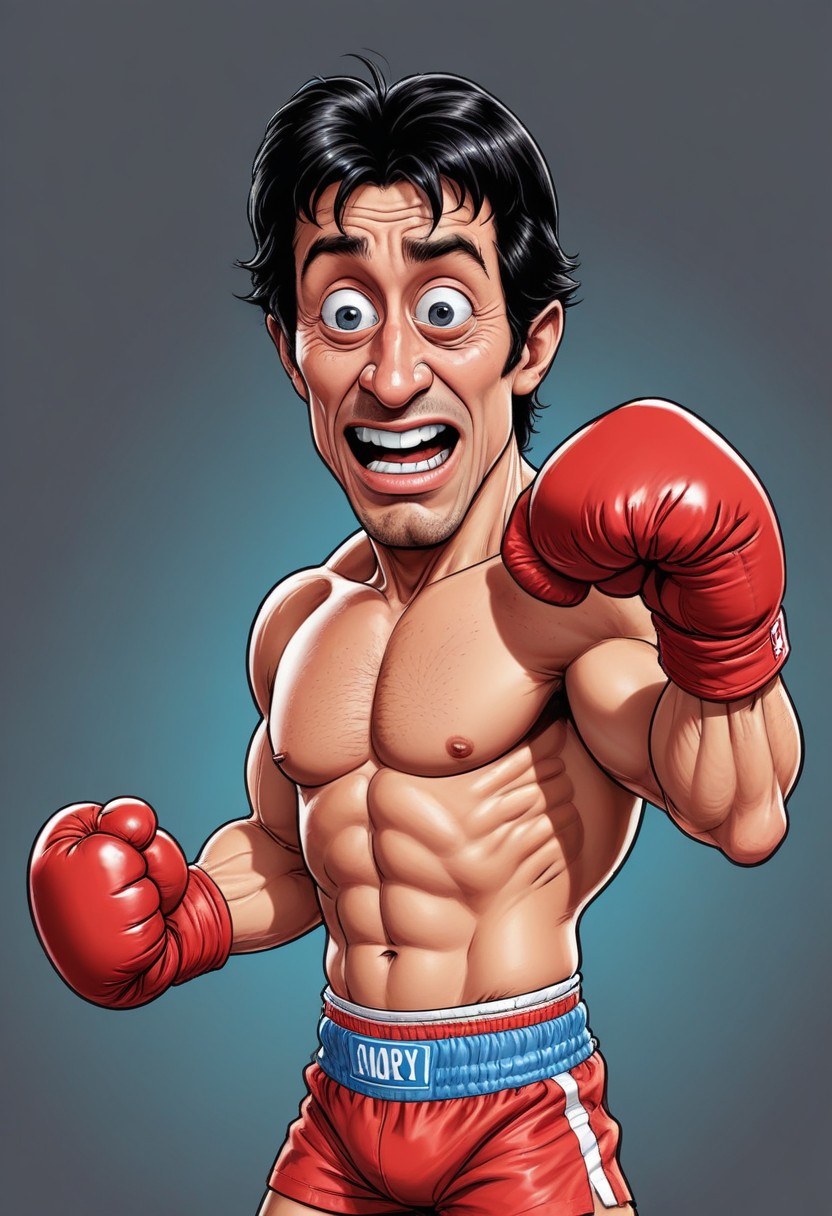 A cartoon boxer with red gloves and shorts, ready to fight, looks directly at the camera with a determined expression.