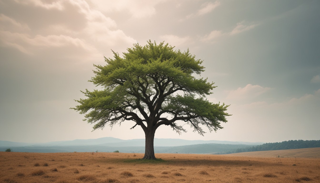 branch, brown, clouds, dry, environment, field, foliage, grass, green, ground, horizon, landscape, lone, nature, outdoor, single, sky, summer, sunlight, tree