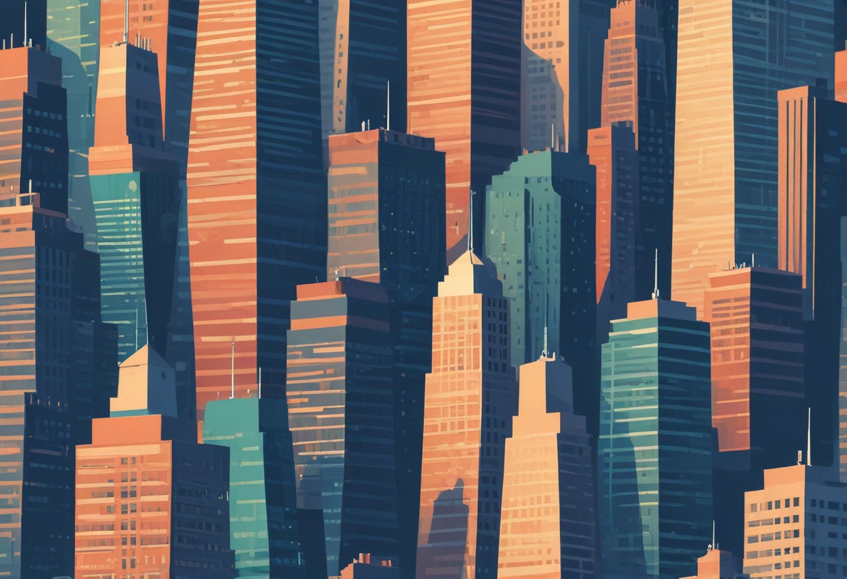 A vibrant cityscape with tall buildings silhouetted against a setting sun.