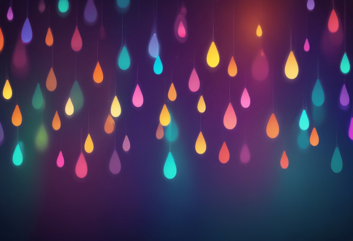 A digital illustration of many colorful raindrops falling on a dark purple background.