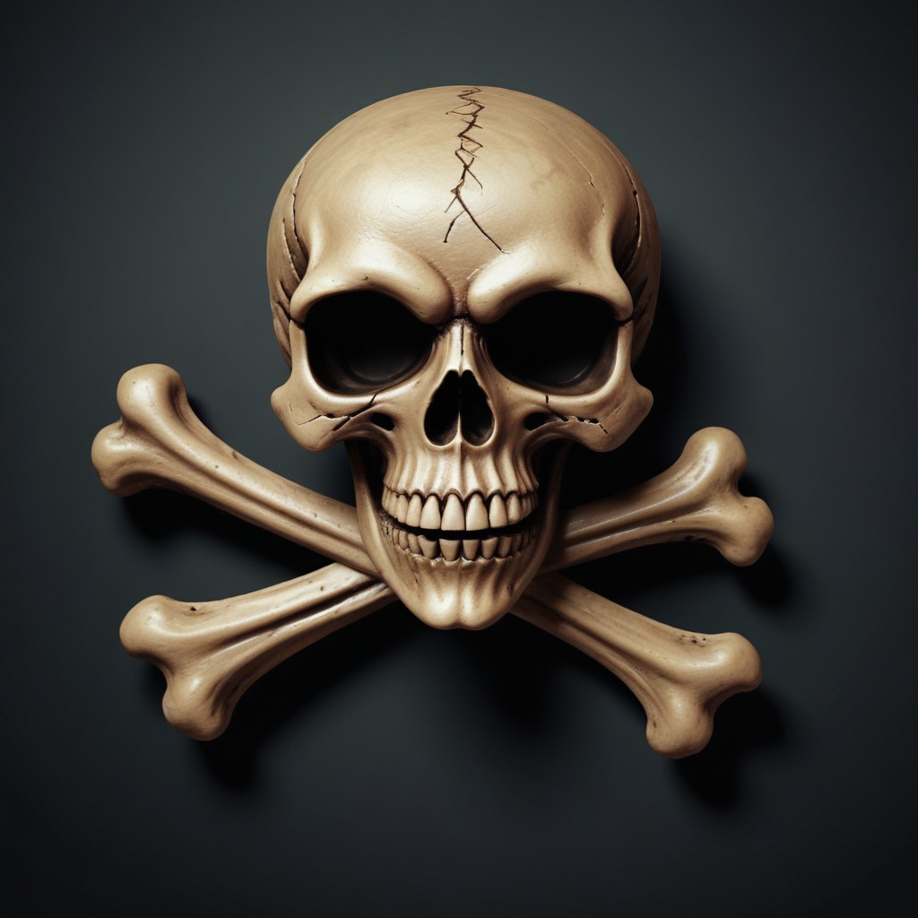 A skull and crossbones symbol on a dark background. The skull is detailed and realistic, with visible teeth and eye sockets.