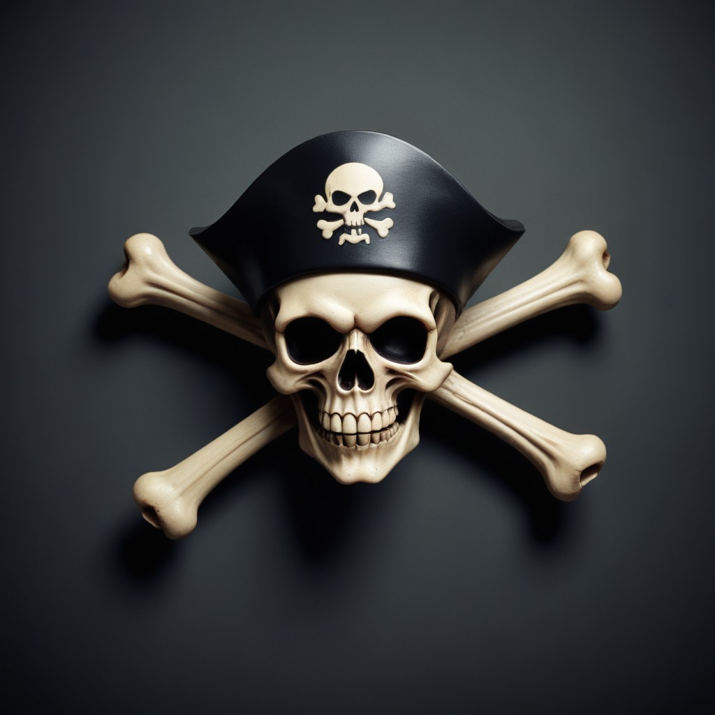 A skull with a pirate hat is shown against a black background. The skull has crossed bones behind it.