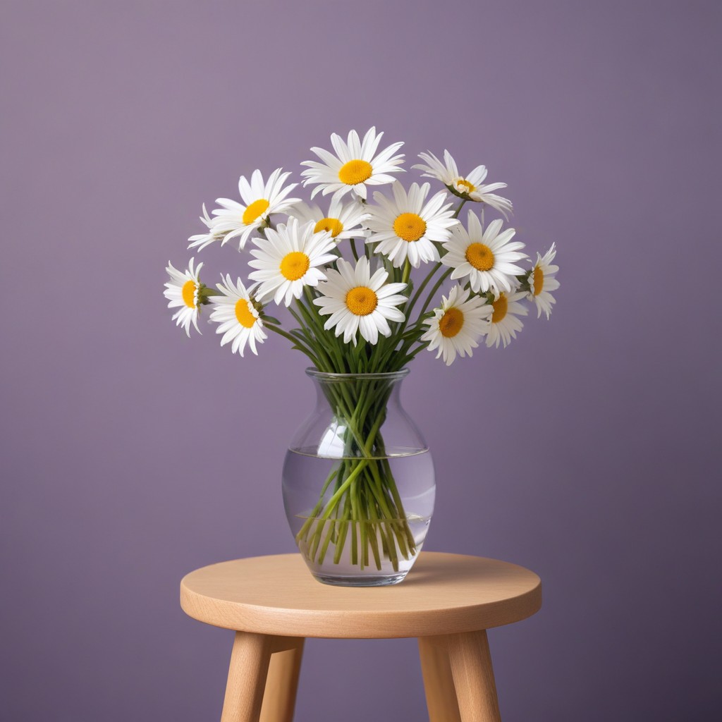 A bouquet of daisies sits in a clear vase on a wooden stool against a purple background.