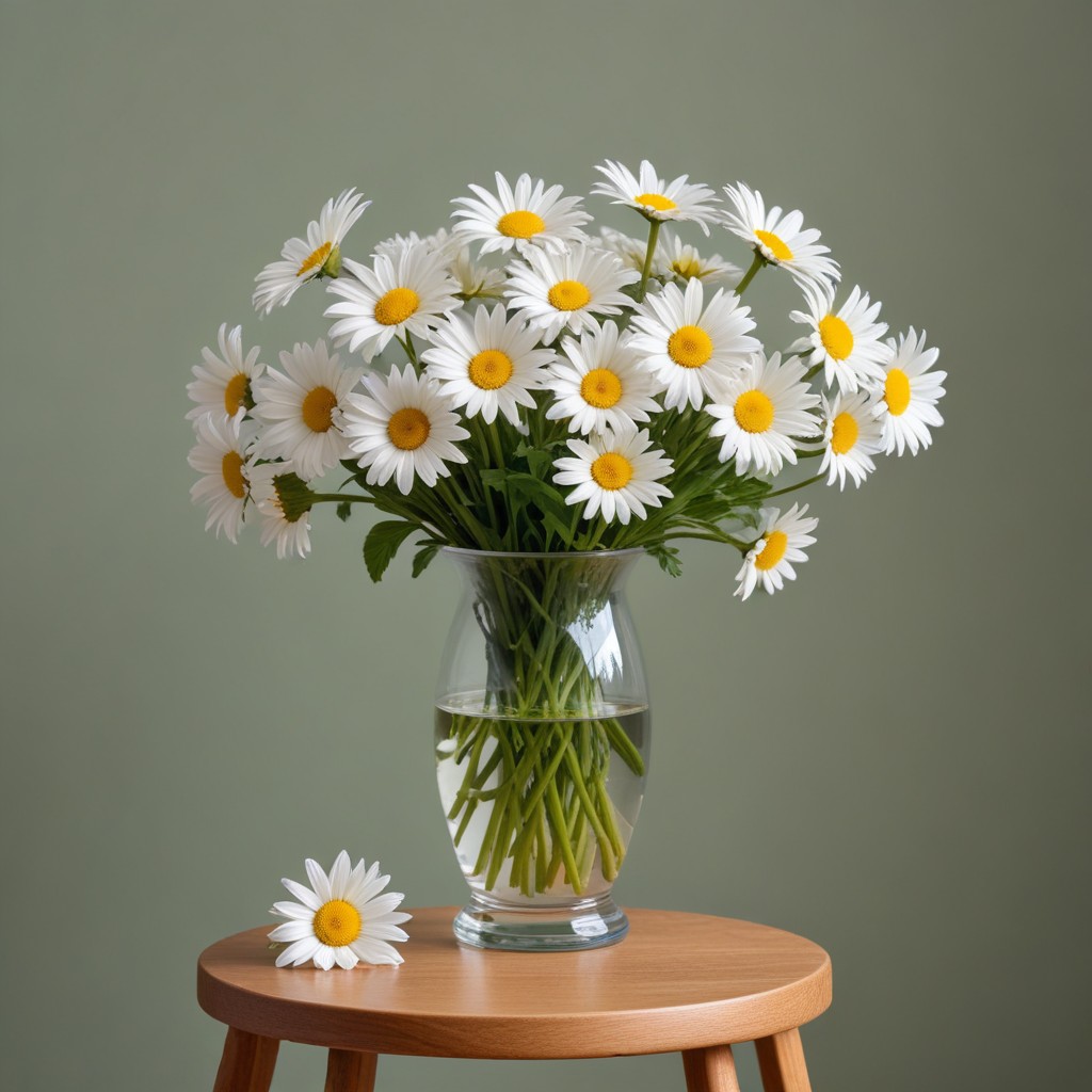 A bouquet of daisies in a clear glass vase sits on a wooden table against a green wall.