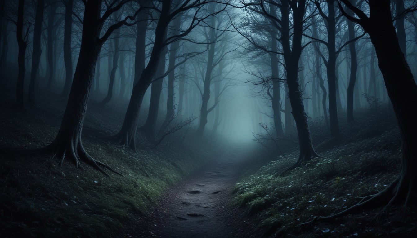 atmosphere, branches, dark, dusk, eerie, fog, foliage, forest, ground, landscape, leaves, light, mysterious, mystical, nature, path, shadows, trees, woodland, woods