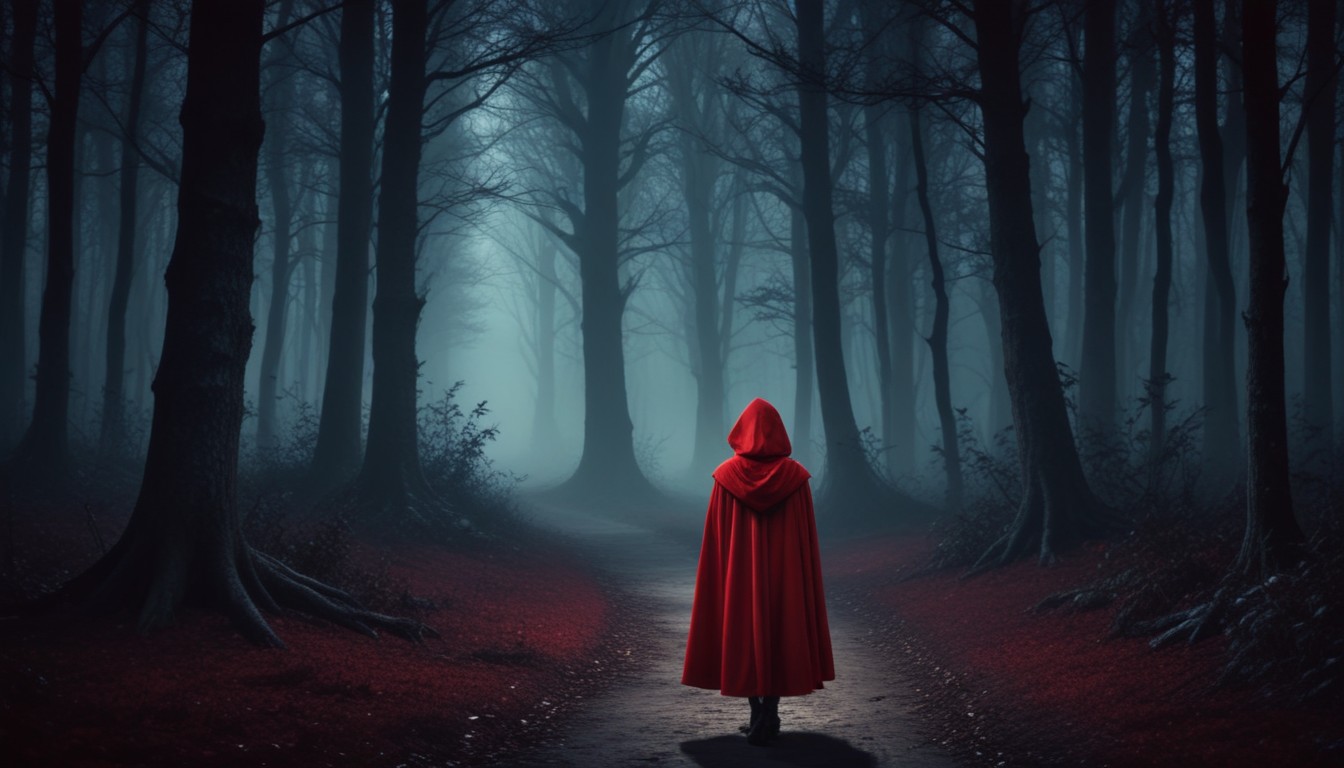 A woman in a red hood walks down a path in a foggy forest. The trees are tall and the air is thick with mist.