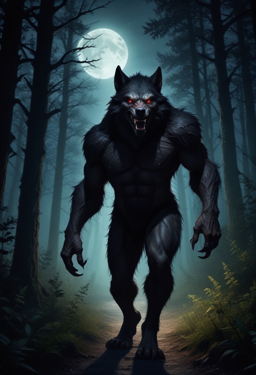 A werewolf with glowing eyes walks through a dark forest under the light of a full moon.