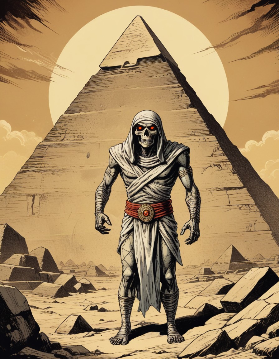 afterlife, ancient, burial, death, desert, dunes, egypt, egyptian, fantasy, hieroglyphics, illustration, landscape, monster, pyramids, robe, sand, skeleton, spooky, tomb, warrior