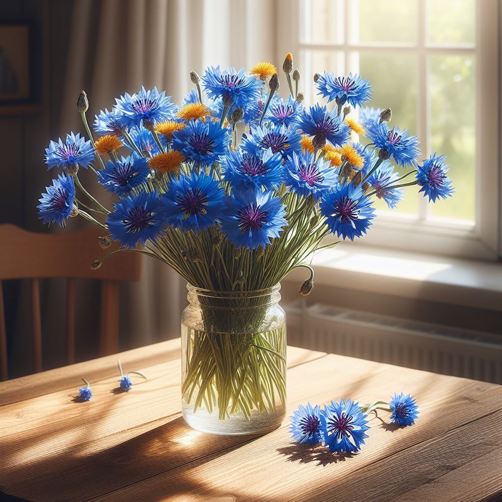 A bouquet of blue cornflowers sits in a glass jar on a wooden table, bathed in the warm sunlight streaming in from a nearby window.
