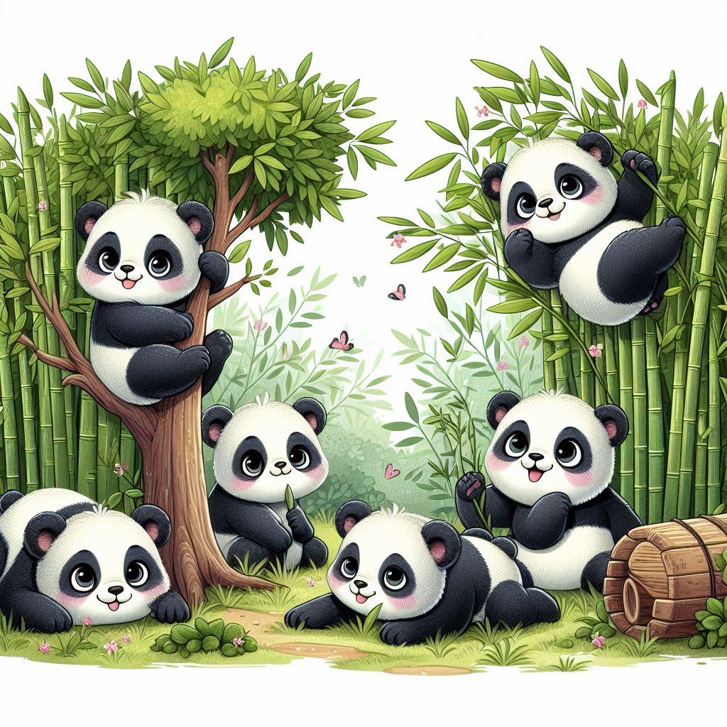 Five adorable panda cubs play and relax in a lush bamboo forest.