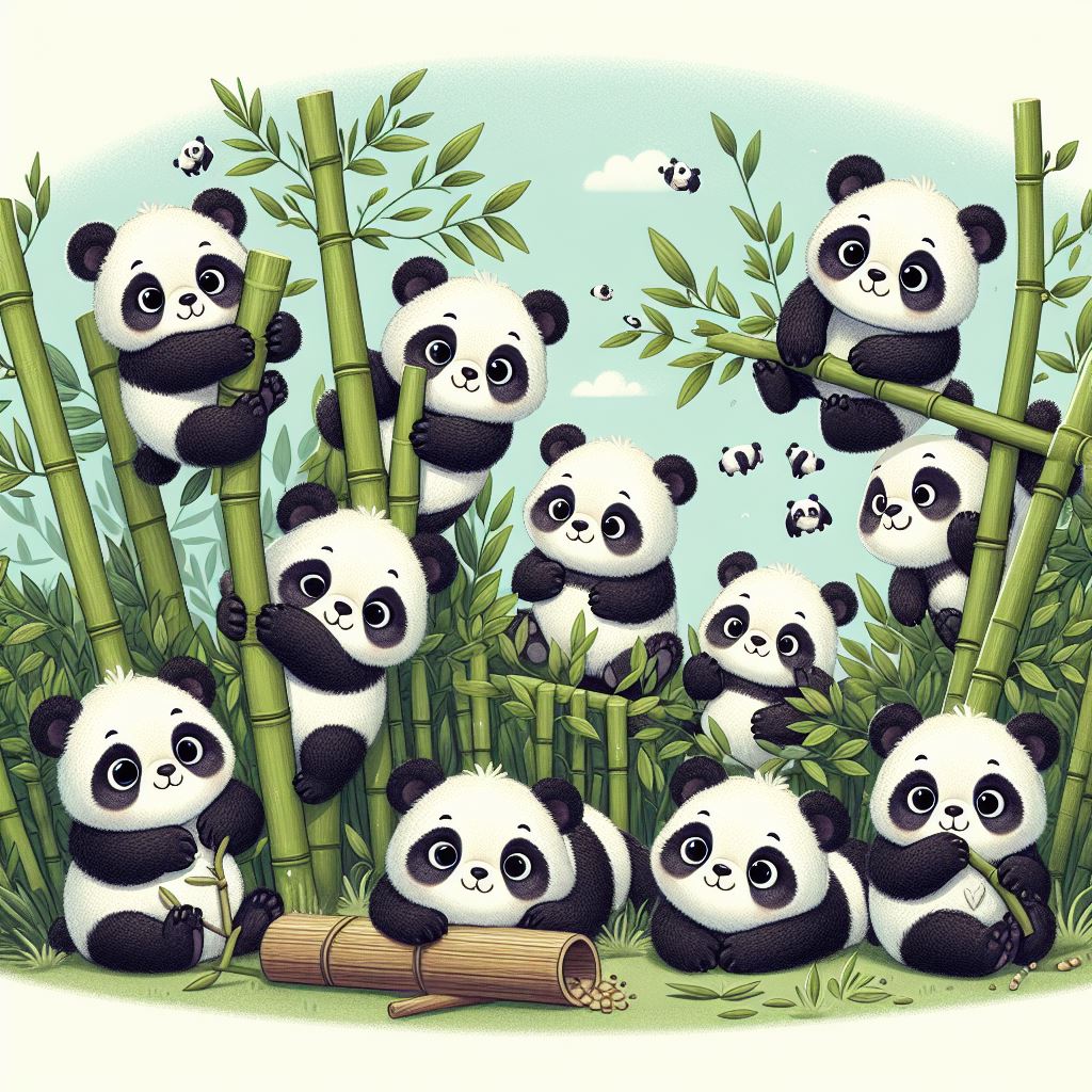A group of adorable panda cubs play and climb in a lush bamboo forest.