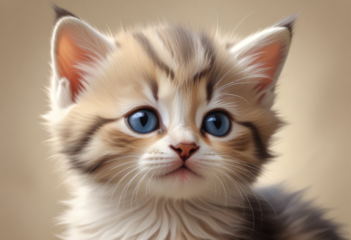 A close-up of a fluffy kitten with blue eyes.