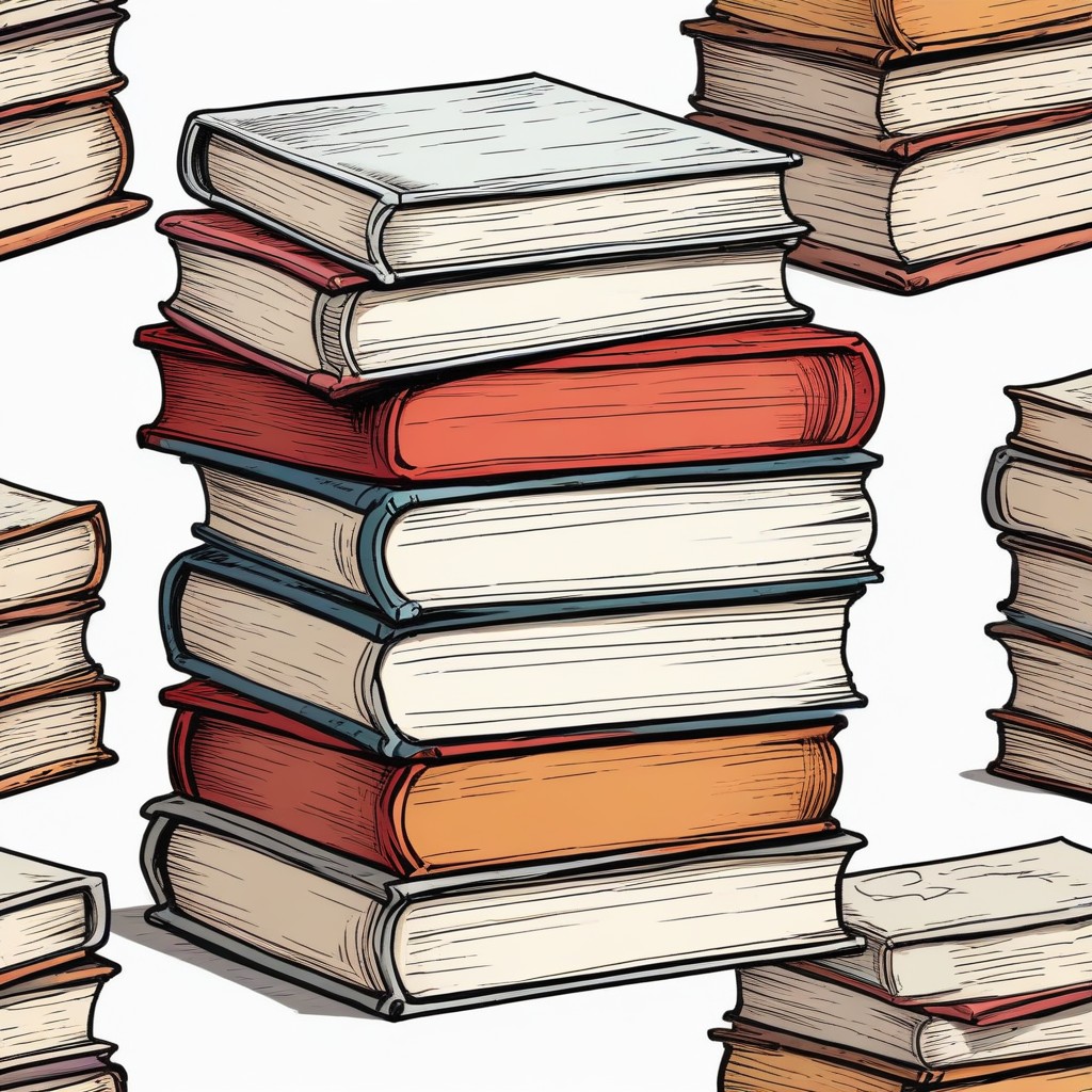 A tall stack of books, with varying cover colors and designs, is shown in a hand-drawn style.