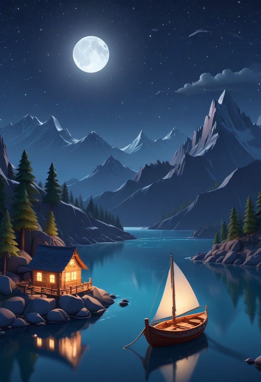A cozy cabin with glowing windows, a sailboat with a lantern on a calm lake under a full moon and starry sky, with mountains in the distance
