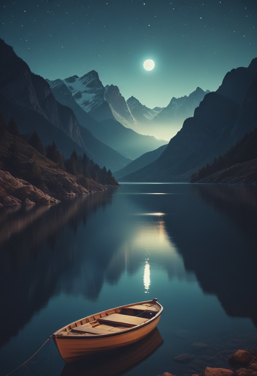 A small boat sits peacefully on a calm lake, surrounded by mountains and illuminated by the bright moon.