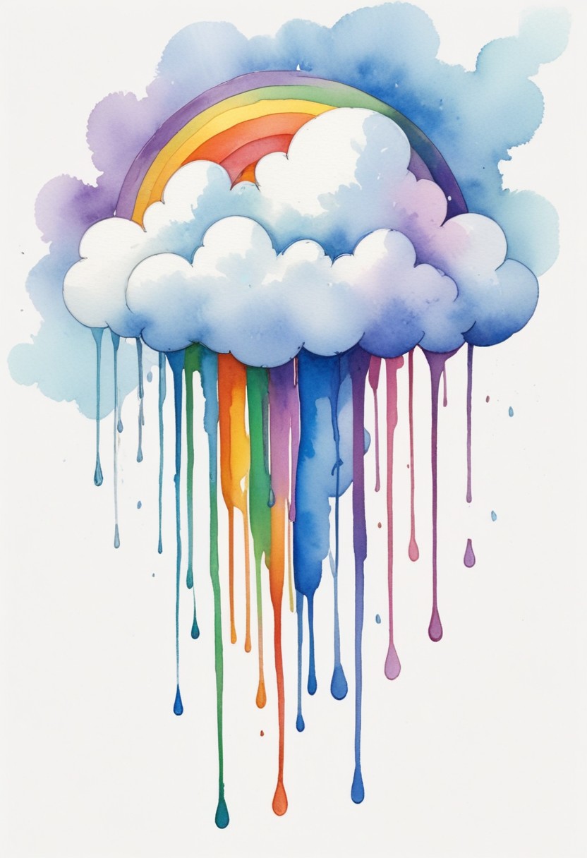 A watercolor painting of a cloud with a rainbow inside, dripping with colorful raindrops.