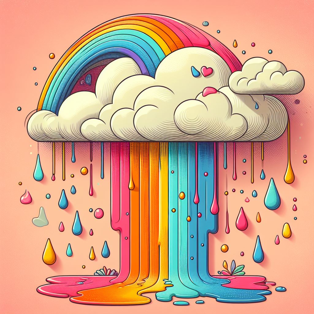 A cloud with a rainbow inside is pouring down colorful rain drops and streaks.