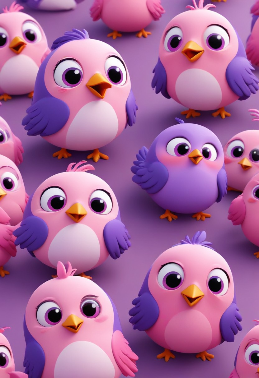 A group of cartoon birds in pink and purple colors on a purple background.