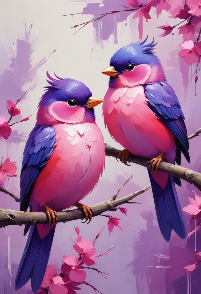 adorable, art, artwork, birds, blossom, blue, branch, couple, cute, fauna, flowers, illustration, love, nature, painting, perched, pink, sweet, togetherness, wildlife