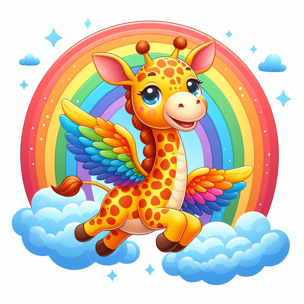 A cartoon giraffe with colorful wings flies through the sky, with a rainbow behind it and clouds beneath it.