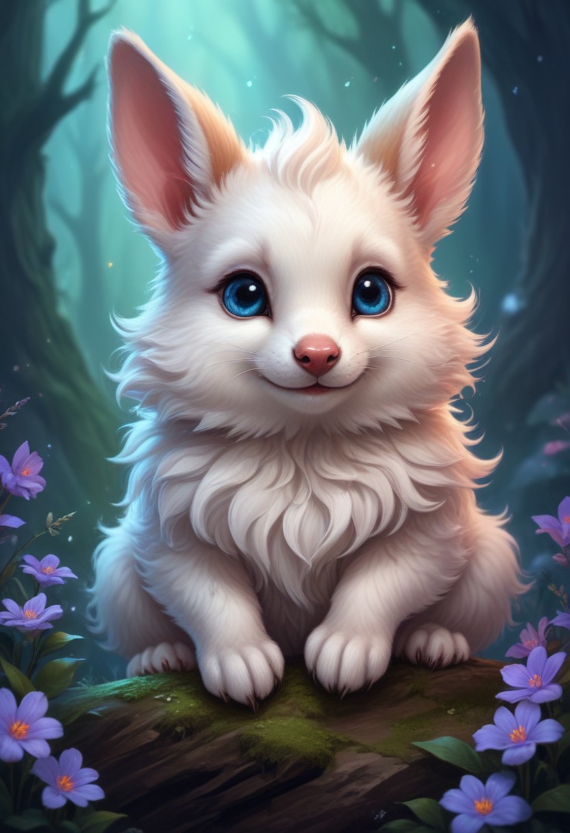 A white bunny with blue eyes sits on a log in a forest, surrounded by purple flowers.