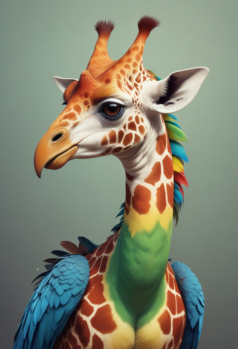 animal, art, bird, blue, brown, colorful, digital, fauna, feathers, giraffe, green, head, illustration, neck, orange, pattern, portrait, wildlife, wings, yellow