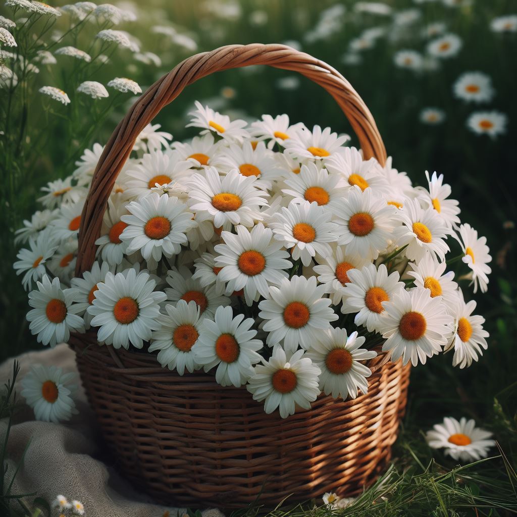A wicker basket filled with white daisies sits on a grassy patch in a meadow.