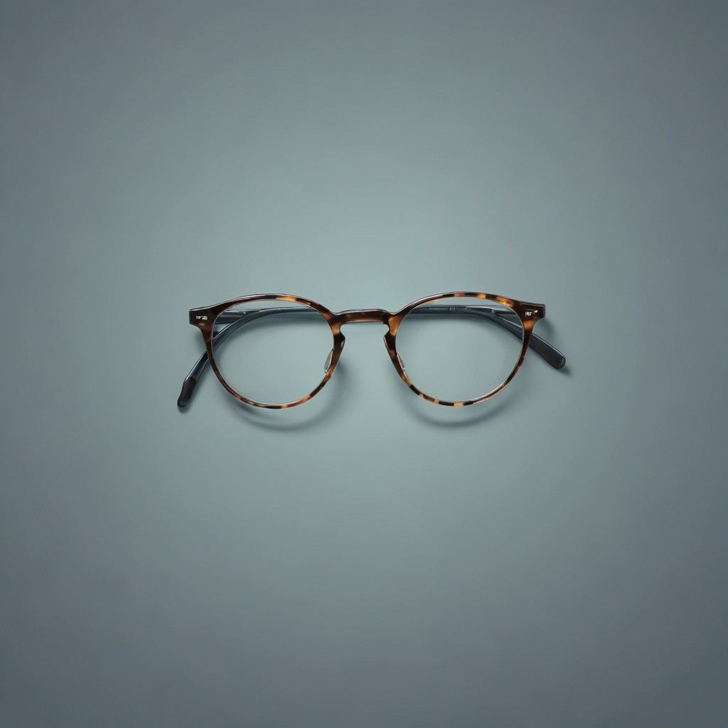 A pair of round eyeglasses with a dark tortoiseshell frame rest on a gray surface.