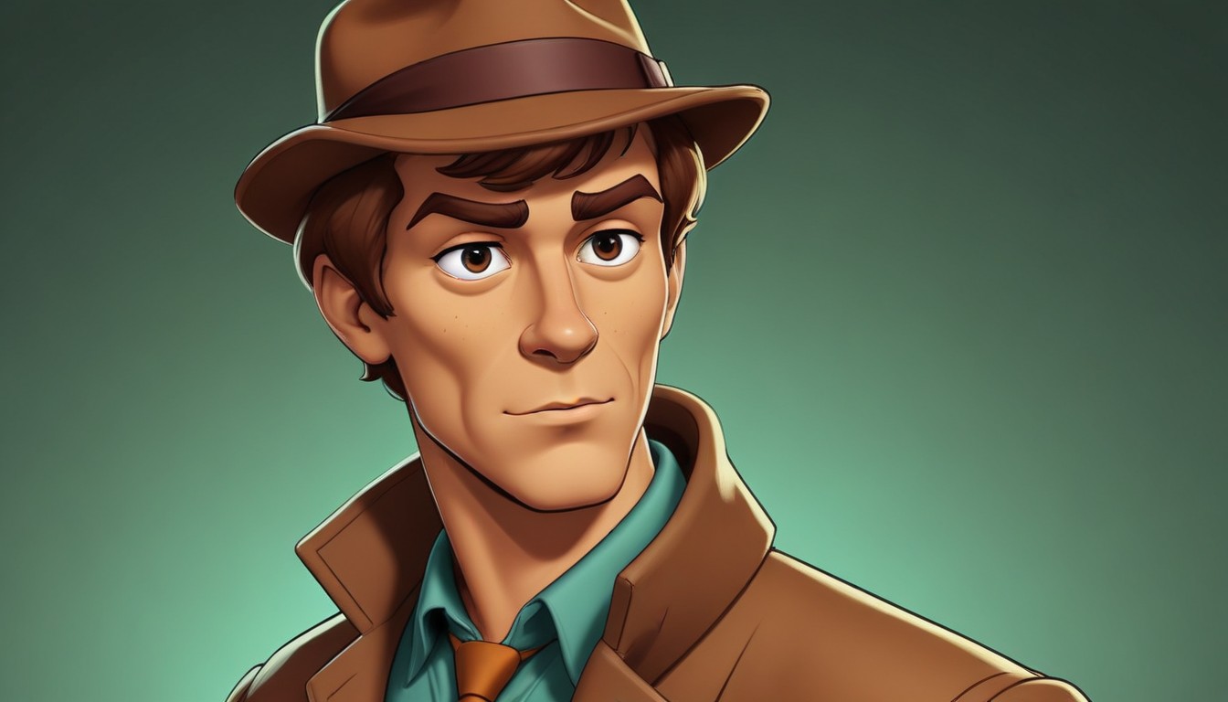 A cartoon detective with brown hair and a fedora stares thoughtfully off to the side.