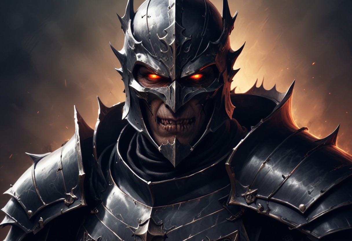 armor, art, artwork, black, character, creature, dark, design, digital, eyes, fantasy, game, helmet, illustration, knight, red, scary, spiked, video, warrior