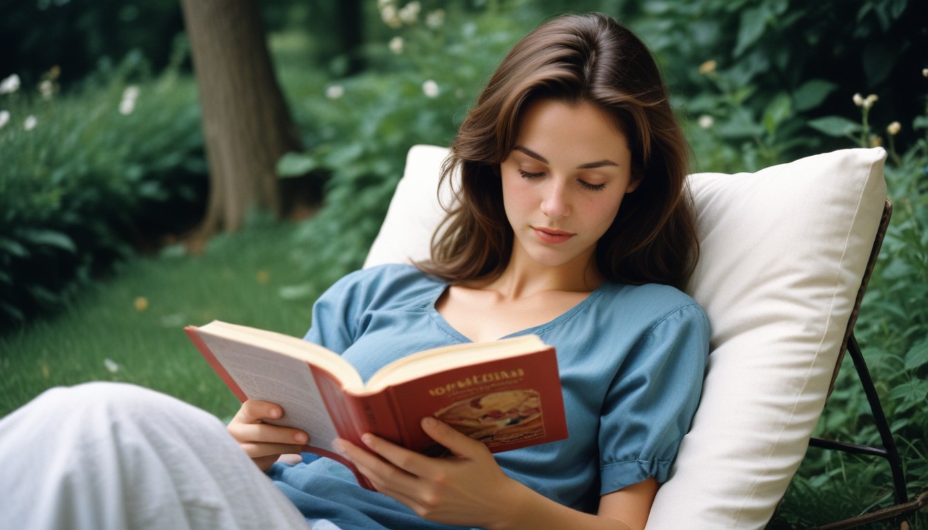 A young woman relaxes in a chair, reading a book in a lush garden.