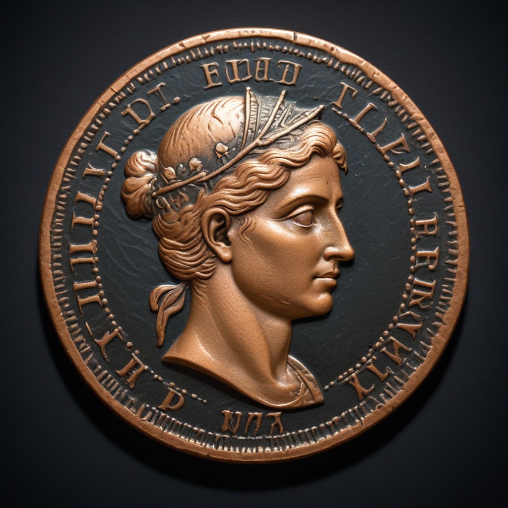 A close-up of a bronze Roman coin featuring the profile of a woman wearing a wreath.