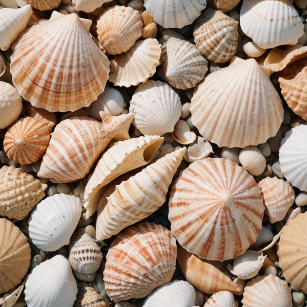 A close-up view of a variety of seashells scattered on a beach, bathed in sunlight.