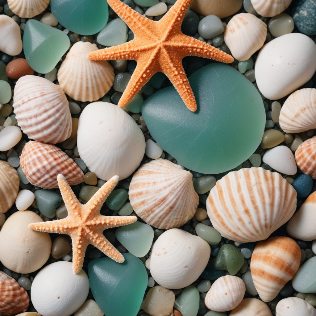 Seashells, starfish, and smooth beach pebbles lay together on the shore.