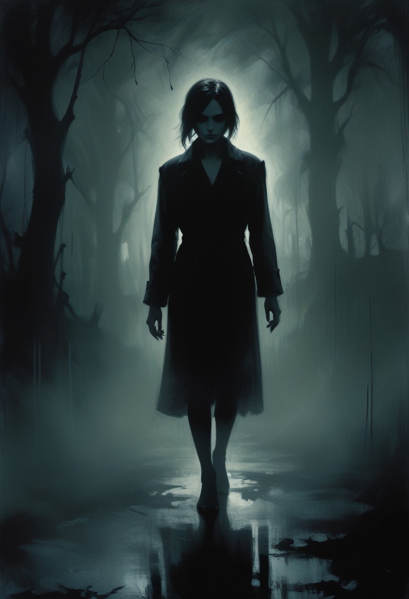 atmosphere, coat, dark, fear, foggy, forest, ground, horror, long, mood, mysterious, night, path, pathway, reflection, silhouette, spooky, trees, walking, woman