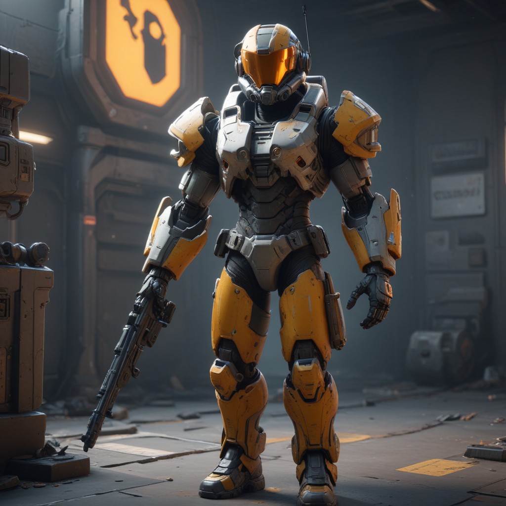 Yellow armored soldier in futuristic setting