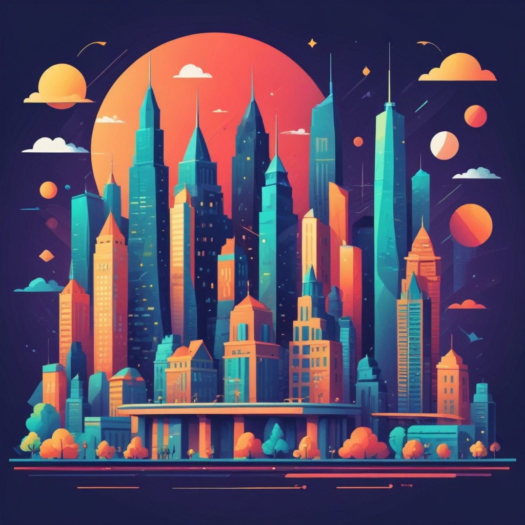 architecture, art, buildings, city, cityscape, clouds, design, digital, graphic, illustration, landscape, modern, moon, night, people, skyline, skyscrapers, stars, urban, walking