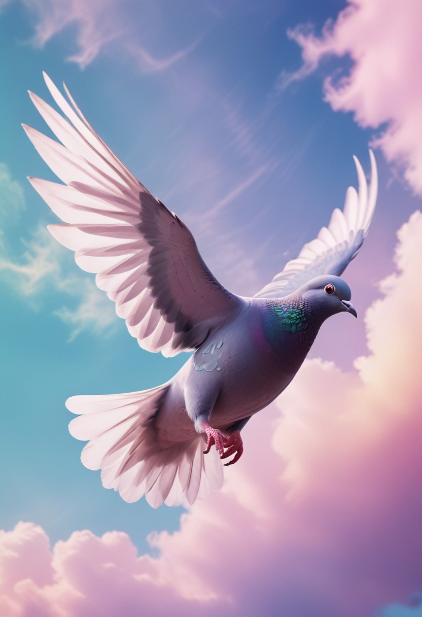 animal, bird, blue, clouds, feather, flying, freedom, high, hopeful, light, nature, peace, pigeon, pink, sky, soar, soft, white, wildlife, wing