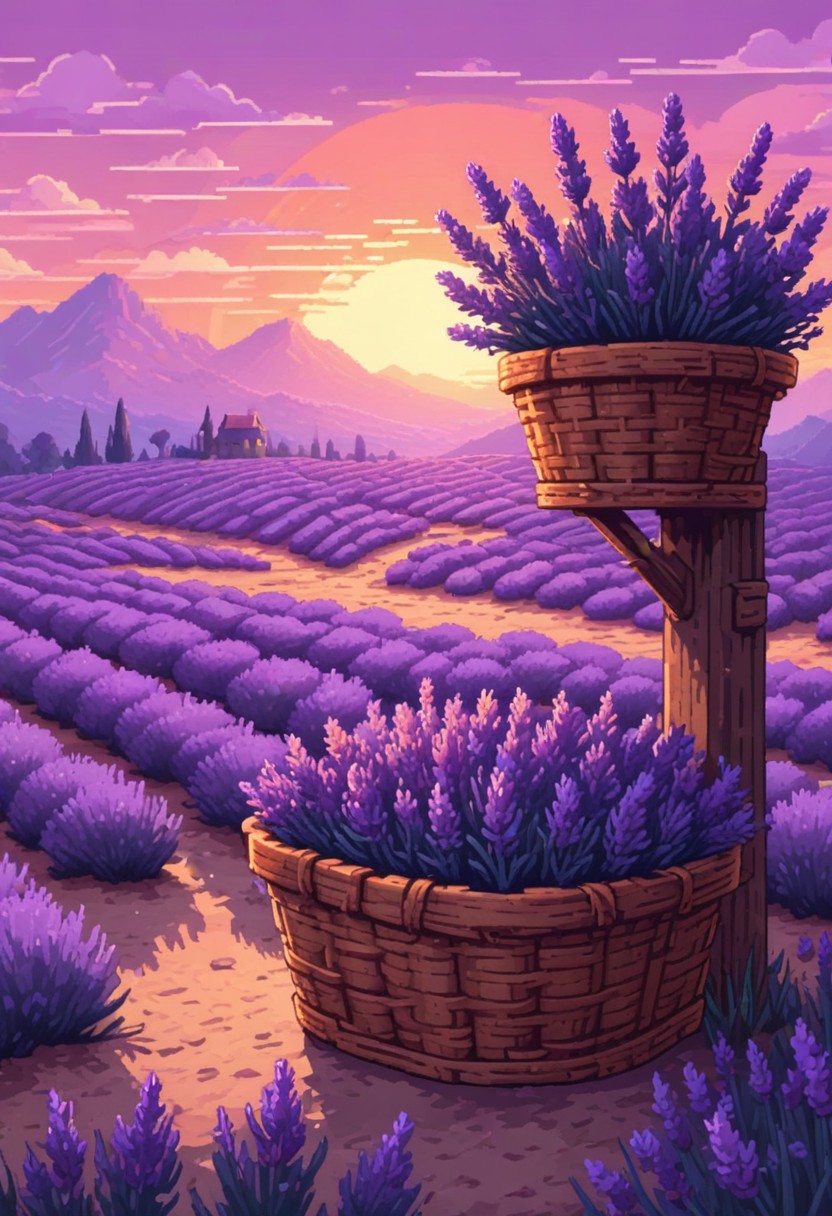 A field of lavender blooms with a sunset sky and a wicker basket filled with lavender.