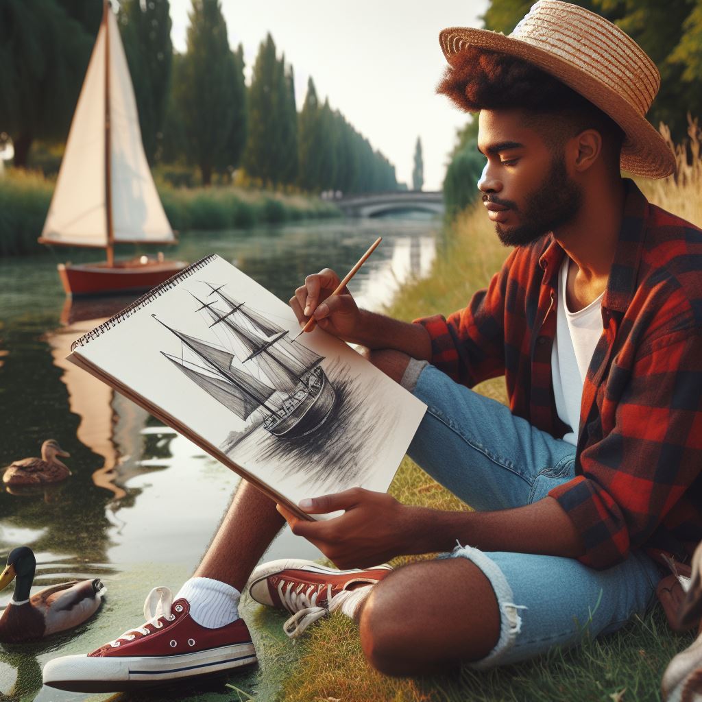 A man sits on a grassy bank by a canal and sketches a ship. Ducks swim in the water.