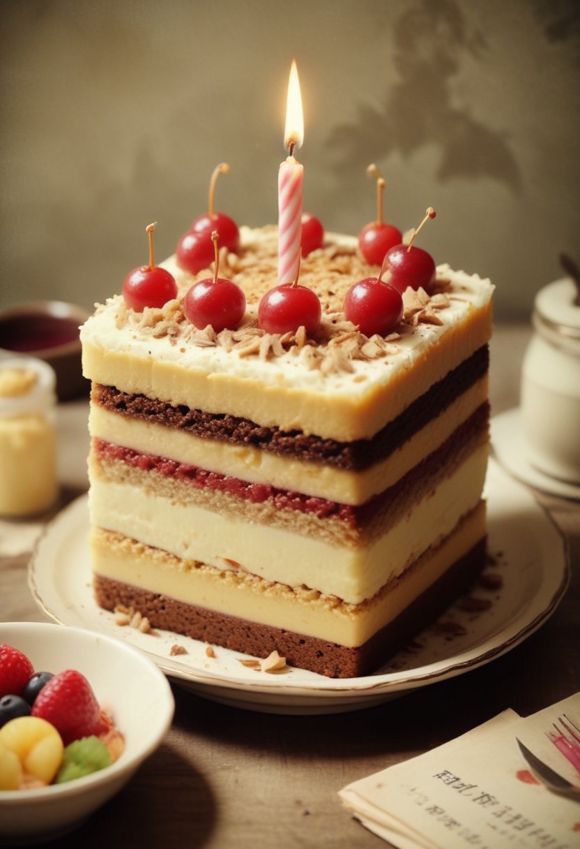 almond, birthday, brown, cake, candle, celebration, cherry, chocolate, delicious, dessert, food, frosting, happy, layered, multi-layered, nuts, party, sweet, treat, white