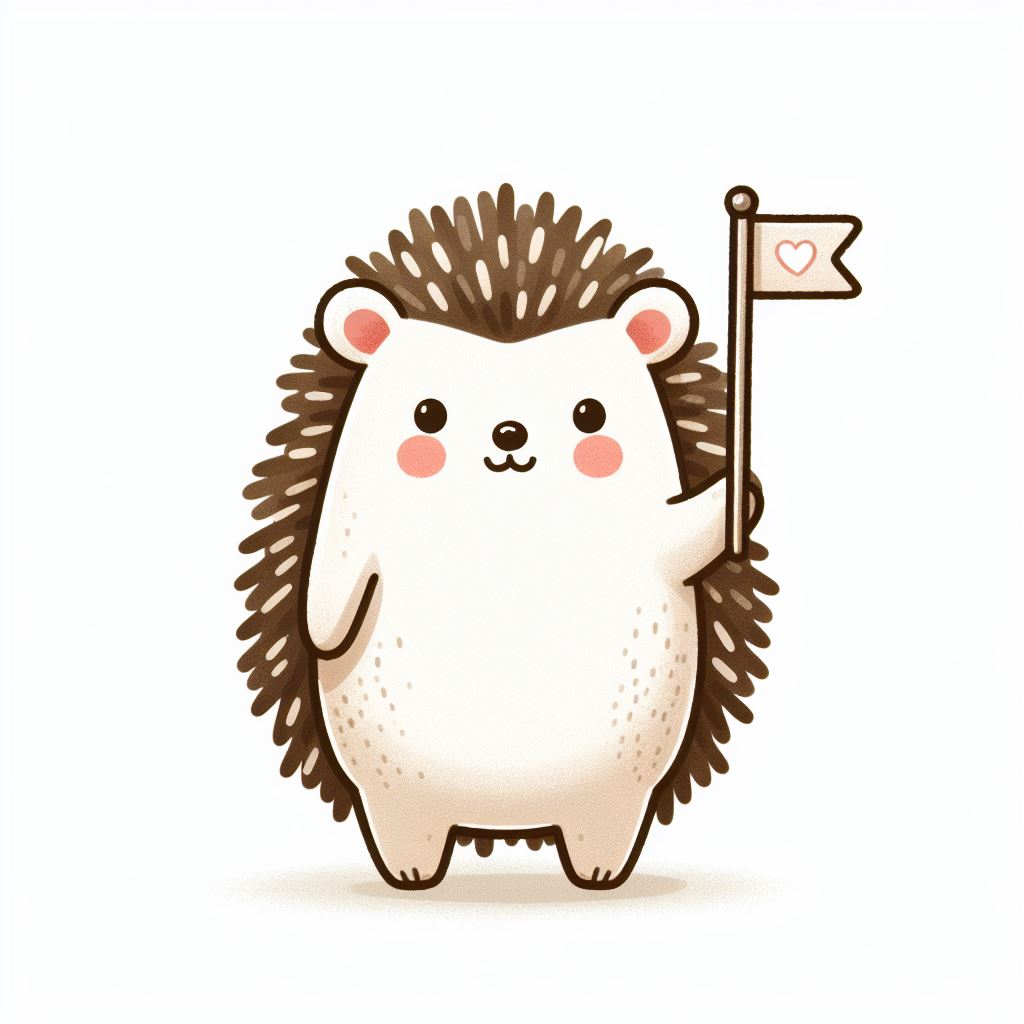 A cartoon hedgehog with a happy expression holds a flag with a heart design.