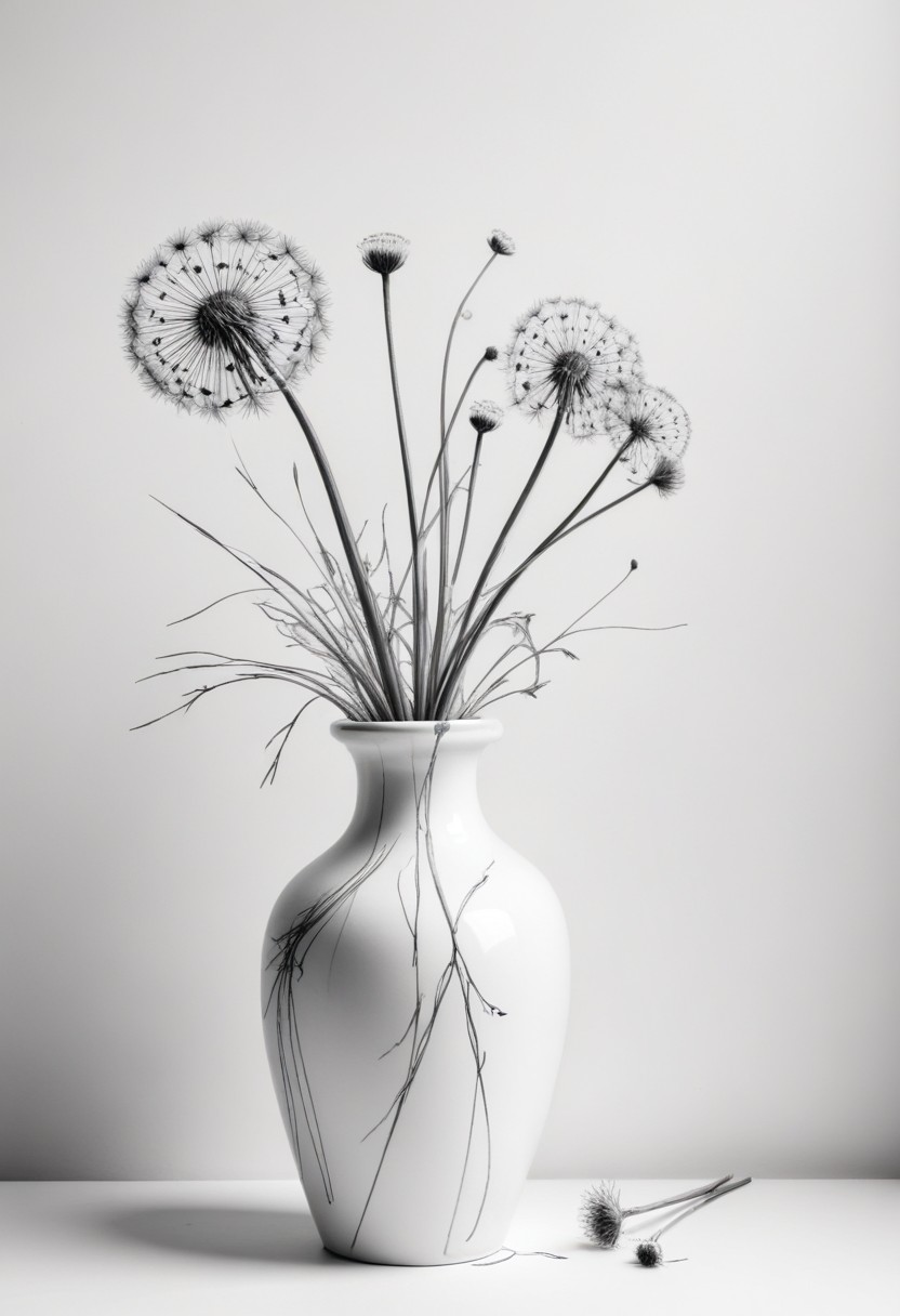 art, beauty, bouquet, dandelion, delicate, design, elegant, floral, flower, fragility, life, light, minimal, monochrome, nature, seeds, simple, still, vase, white