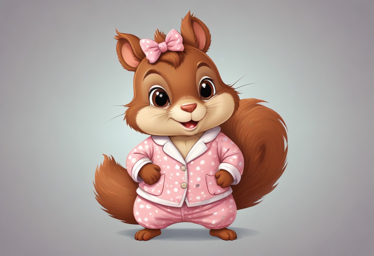 A cartoon squirrel wearing pink pajamas with white polka dots smiles and stands with its hands on its hips.