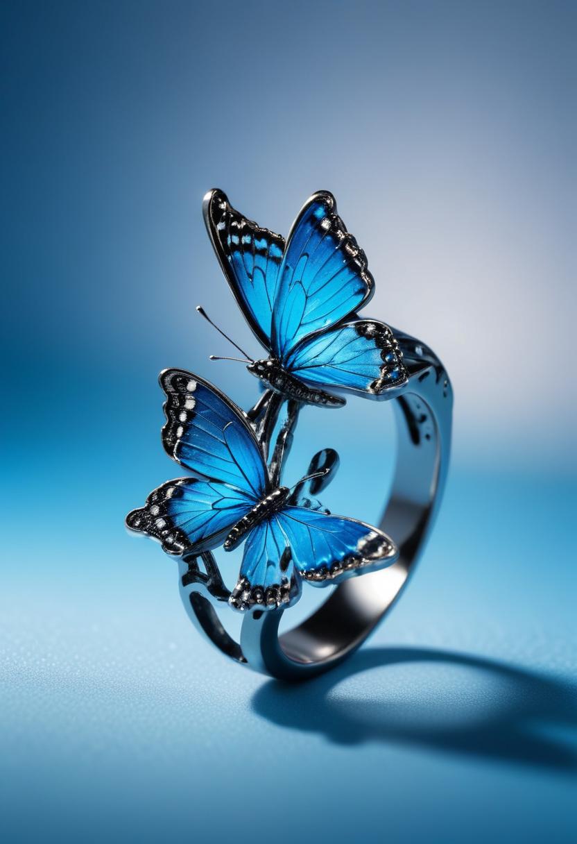 A close-up of a silver ring featuring two blue butterflies.