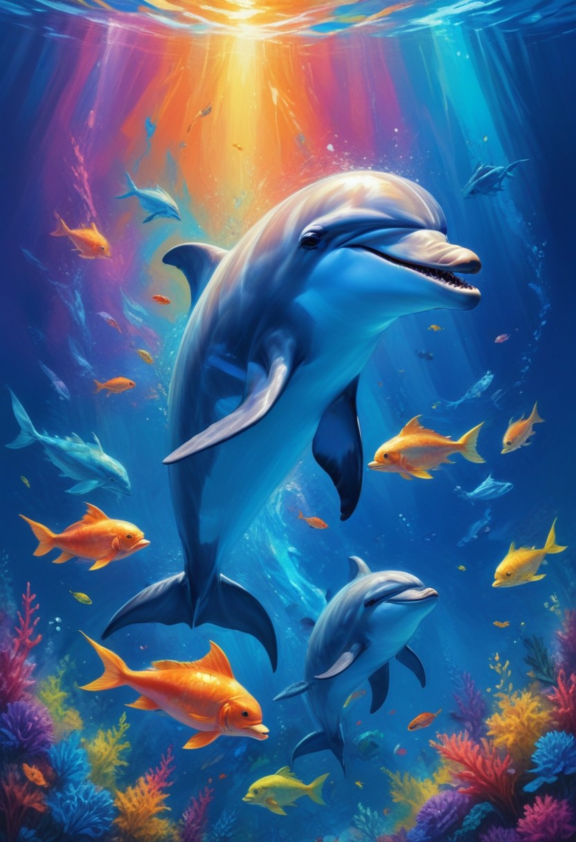 Two dolphins swim in a vibrant underwater scene, surrounded by colorful coral and fish, as sunlight streams through the surface.