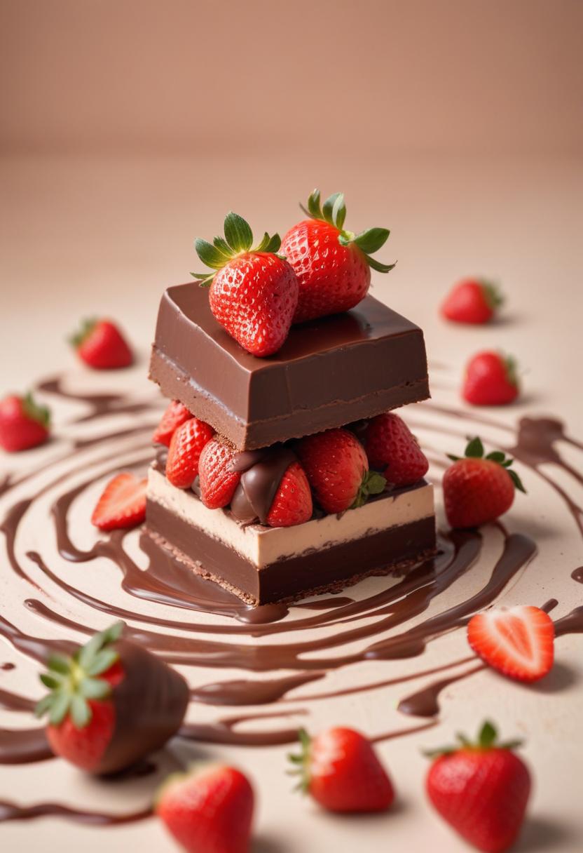 A chocolate cake layered with strawberries and chocolate sauce, surrounded by strawberries.