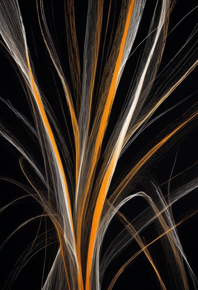 Abstract artwork featuring orange and white lines radiating outwards against a black background.