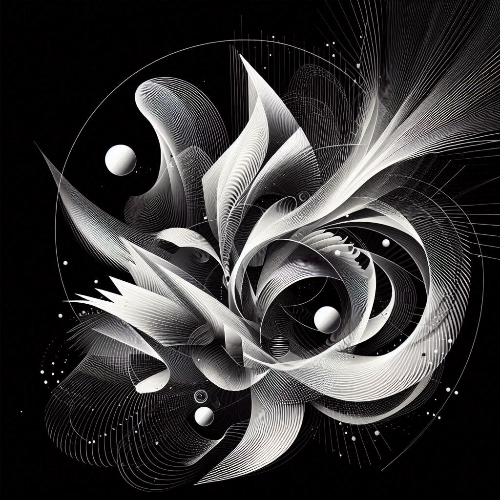 A digital art piece with an abstract design, featuring lines, curves, and circles in a black and white color scheme.