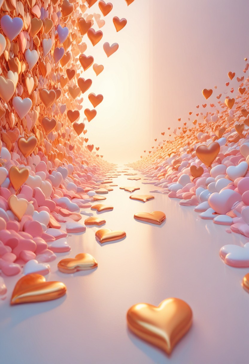 A path of golden hearts leads through a field of pink and white hearts, with more hearts floating in the air above.